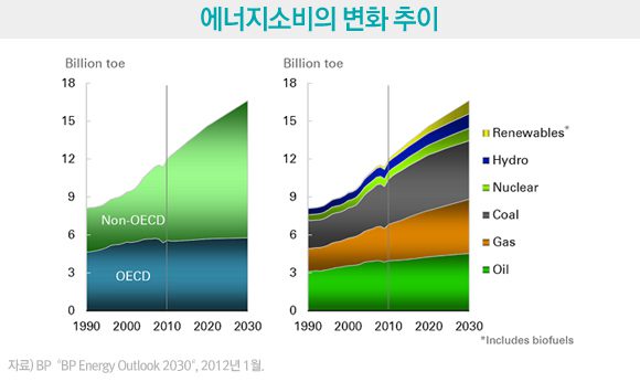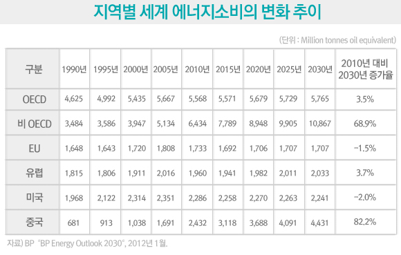 영국 BP가 올해 1월에 발간한 “BP Energy Outlook 2030”에 따르면, 세계 에너지 소비는 2010년에는 12,002Mtoe이지만, 2030년에는 16,632Mtoe로 20년 동안 약 38.6% 증가할 것으로 예상됩니다. 같은 기간 중 에너지 소비 증가율은 OECD 국가는 3.5%, 비 OECD국가는 68.9%로 에너지 소비 증가는 비 OECD국가들이 주도한다고 해도 과언이 아닙니다.
