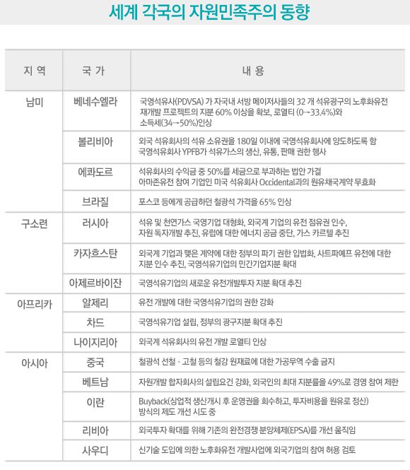 예를 들어, 중남미의 최대 천연가스 보유국인 베네수엘라는 2007년 4월 모든 자원에 대한 국유화를 선언하고, 에너지와 광물 자원에 대해 국내외 기업이 맺었던 모든 계약을 무효로 돌렸습니다. 그리고 정부를 통해 지분을 임대 받는 방식으로 재계약을 체결토록 했습니다. 남미에서 천연가스 매장량 2위인 볼리비아는 석유와 가스 산업 시설에 대한 국유화 조치를 발표했고, 2006년 다국적 기업이 보유하고 있는 자원의 통제권을 볼리비아 국영 에너지기업으로 이양하는 조치를 단행한 바 있습니다.