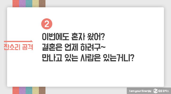 다가오는 설 명절, 앞서 소개해 드린 잔소리 대처법과 함께 애정 어린 가족들의 잔소리를 조금 더 슬기롭게 대처해 보길 바랍니다. 이번 명절은 오랜만에 만나는 가족 친지 분들과 함께 더 즐겁고 더 행복한 시간 보내세요 🙂
