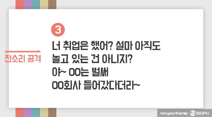 설문조사가 보여주듯 설날이 마냥 달갑지만은 않습니다. 어느 순간부터 대한민국에서 힘겹게 하루하루를 살아가는 청춘들에게 명절이란 잔소리Day로 여겨지는 날 중 하나가 되어버렸죠. 누군가는 이번 설 연휴에 고향에 내려가지 않거나 멀리 여행을 떠날 계획을 세우고 있는지도 모릅니다. 명절 잔소리로 인해 친인척과의 만남을 피하는 당신을 위해 준비했습니다. 피하지 말고 당당해져라! 명절 잔소리 대처법!