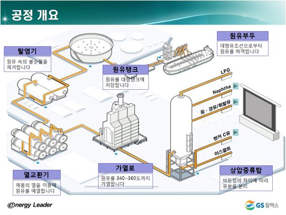 일단, 원유입니다. 2010년 우리 회사는 중동에서 80% 정도, 아시아와 기타 지역에서 20%를 수입했으며, 50종의 원유를 처리했지요. 원유는 탄소(80~86%), 수소(12~15%), 기타(황, 질소, 산소 등, 1~3%)로 구성된 혼합물로, 색깔은 암녹색 또는 흑갈색을 띄며 끈적끈적한 것이 특징이라고 합니다.