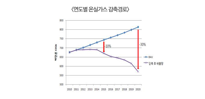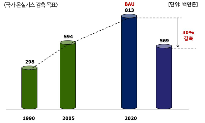 우리나라는 국제사회에서 보면 온실가스를 의무적으로 감축해야 하는 나라에 속하지 않습니다. 기후변화협약에서 말하는 의무 감축국에 포함되지 않은 것이죠. 하지만 우리나라는 저탄소 녹색성장을 국가 비전으로 선언하고 기후변화 대응에 적극적인 노력을 하겠다는 의지를 국제사회에 표현해 왔습니다. 결국 그 의지는 우리나라로 하여금 자발적인 온실가스 감축 목표를 설정하도록 만들었습니다. 온실가스에 관심이 있는 여러분들이라면 한번쯤은 들어본 아니 요즘은 매우 흔하게 들으실 수 있을 거라 생각하는 우리나라 국가 온실가스 감축 목표 “2020년 BAU(배출전망치) 대비 30% 감축”이라는 목표를 세우게 된 것이죠.
