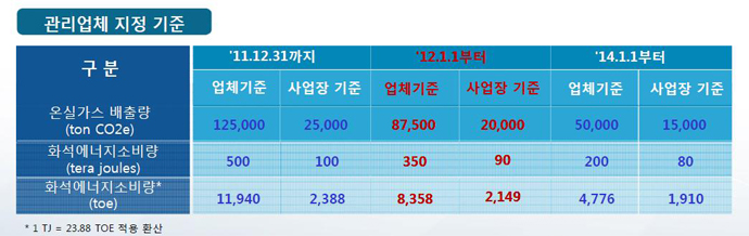 그렇다면 어느 정도가 온실가스를 많이 배출하는 것이고, 에너지를 다량 소비하는 것인가를 알아야죠. 여기에 대한 기준이 목표관리제도에 참여하느냐 참여하지 않느냐를 결정하는 중요한 요소가 되는 것입니다. 먼저 큰 것부터 관리해나가고자 하는 것이죠.