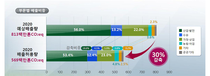 각 부문별로 배출 전망치와 감축목표에 따른 온실가스 배출목표를 설정하였고, 각 부문의 온실가스 감축 목표를 토대로 업종의 배출 목표 로드 맵도 설정 되었습니다. 그에 따라 매년 목표협상을 통해 각 부문 내 업종 및 업체 별로 배출목표를 설정하게 됩니다.