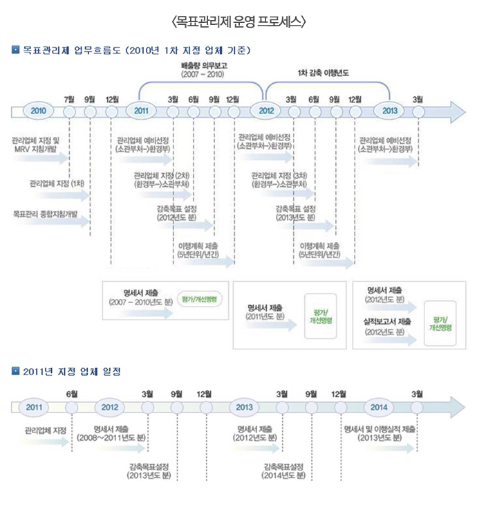 정부는 2009년 11월에 확정․발표한 국가 온실가스 감축목표(’20년 BAU 대비 30% 감축)를 산업․전환, 건물․교통, 농축산 등 부문 및 부문 내 세부 업종별로 구체화한 감축목표를 설정하여 국가 온실가스 감축 로드 맵을 만들었습니다. 이렇게 만들어진 국가 온실가스 감축 계획에 의거하여 목표관리제의 목표 설정이 가능해지게 되었습니다.