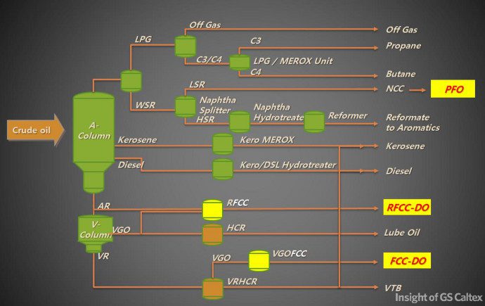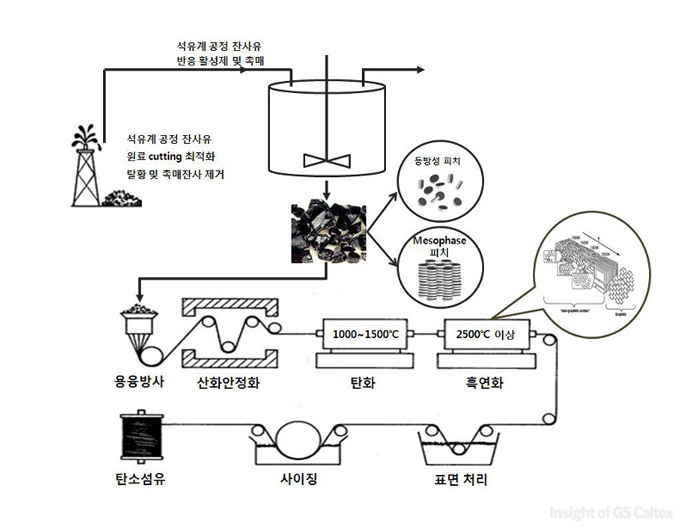 이 비싼 걸로 비즈니스를 하려고? 아니죠. 비싸면 싸게 만들어야죠. GS칼텍스는 고도화 시설을 갖추고 난 후 다양한 종류의 정유 잔사유를 생산하고 있습니다. 이들은 주로 선박용 벙커C유나 아스팔트로 이용됩니다. 아스팔트에서 기름을 뽑는다는 회사 광고를 보셨을 겁니다. 그런데, 아스팔트에서 탄소섬유도 만들 수 있다는 사실은 모르셨죠? 저가의 석유계 잔사유(아스팔트)는 탄소섬유의 전구체인 Pitch의 원료가 되며 이 때문에 Pitch계 탄소섬유는 PAN계에 비해 가격경쟁력을 확보할 수 있습니다.