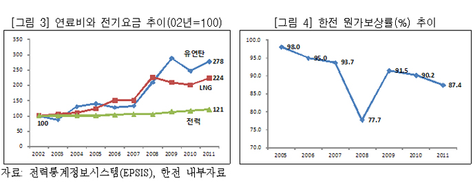 2002년에서 2011년 사이 우리나라에서 원자력과 함께 전력 생산의 주된 연료로 사용되는 유연탄과 LNG 가격은 각각 178%, 124% 급증했는데, 전기요금은 단지 21% 상승에 그쳤습니다. 이에 따라 국민들에게 전력을 공급하는 한전의 원가보상률(판매단가/전력공급원가)은 2005년 이후 100%를 밑돌면서 지속적으로 악화되고 있습니다.