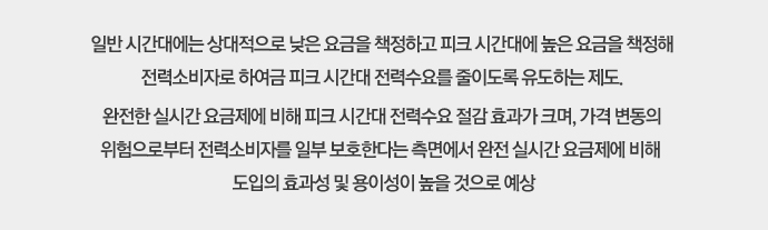 그러나 향후 전력수급 불안이 장기간 지속될 전망이고 발전설비 확충에 짧게는 4년, 길게는 10년이 소요됨을 감안한다면 전력수급 안정을 위해 적극적인 수요관리는 불가피하며, 이에 따라 수요관리의 방식을 기존의 인센티브 기반에서 요금 기반으로 전환해야 한다는 요구가 커지고 있습니다. 그런데, 요금에 기반한 수요관리는 가격신호에 의해 전력소비자가 자발적으로 전력수요를 줄이거나 전력수요를 다른 시간대로 옮기도록 유도하는 방식입니다.