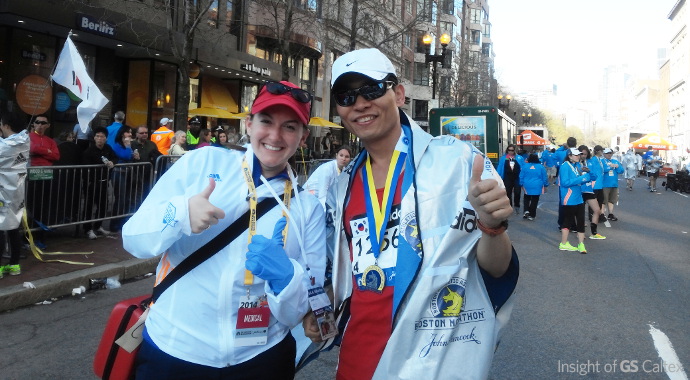 완주 후에 간식을 먹으며 걷고 있는데, 한 여학생이 “구을회 부장님”을 아느냐며 제 일행에게 물어봐서 만났는데, 그녀는 22세 한국인 유학생으로 마라톤을 하고 싶어 방법을 찾다가 제가 회사 블로그에 올린 글을 보고 저를 만나고 싶어 무작정 보스턴마라톤 대회장까지 와서 동양인으로 보이는 사람마다 물어물어 찾았다고 했습니다.