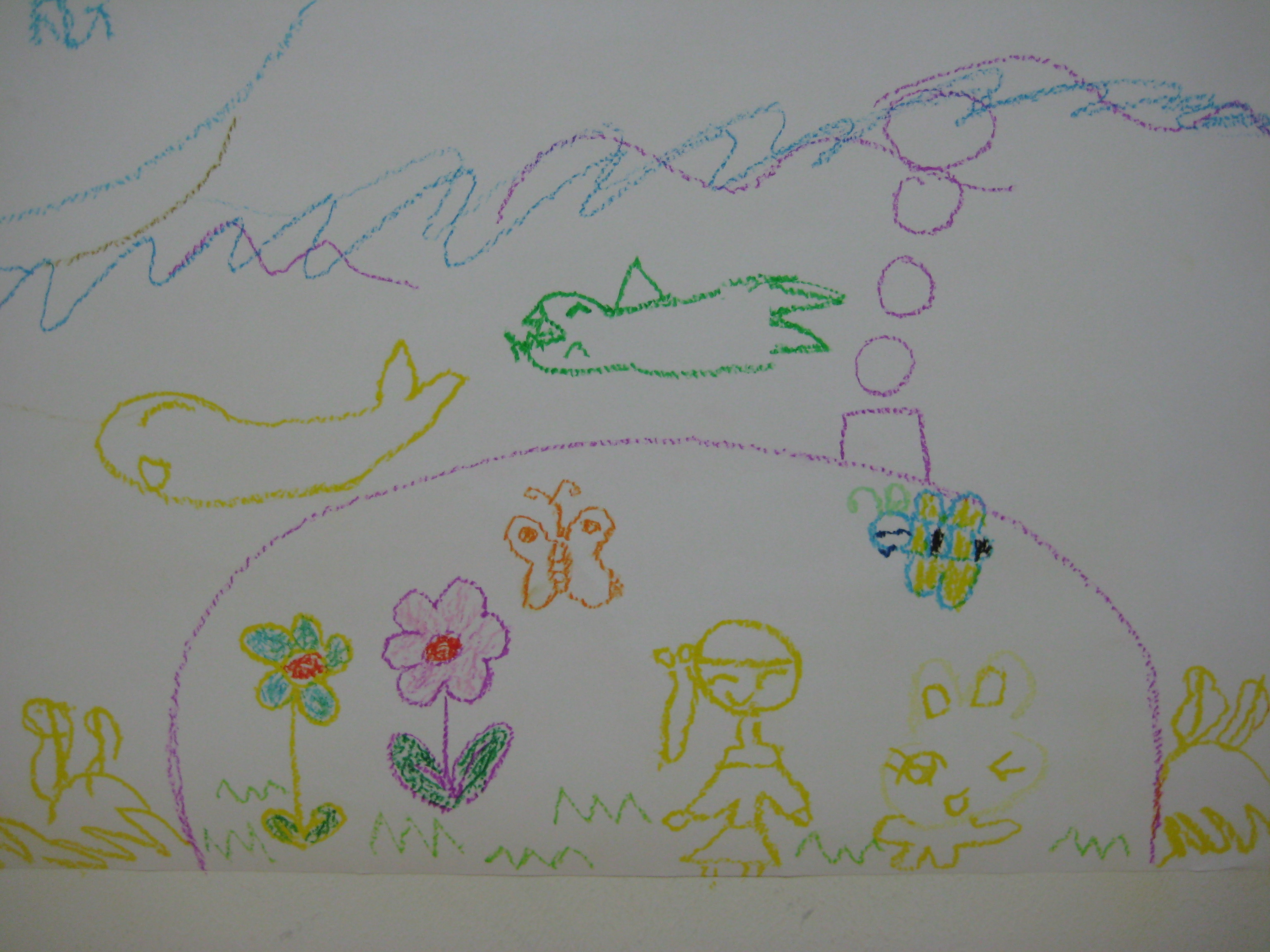 초등학교 1학년 여학생의 그림. 자신과 꽃과 벌들이 바닷 속에 있는 상상을 하며 그린 그림