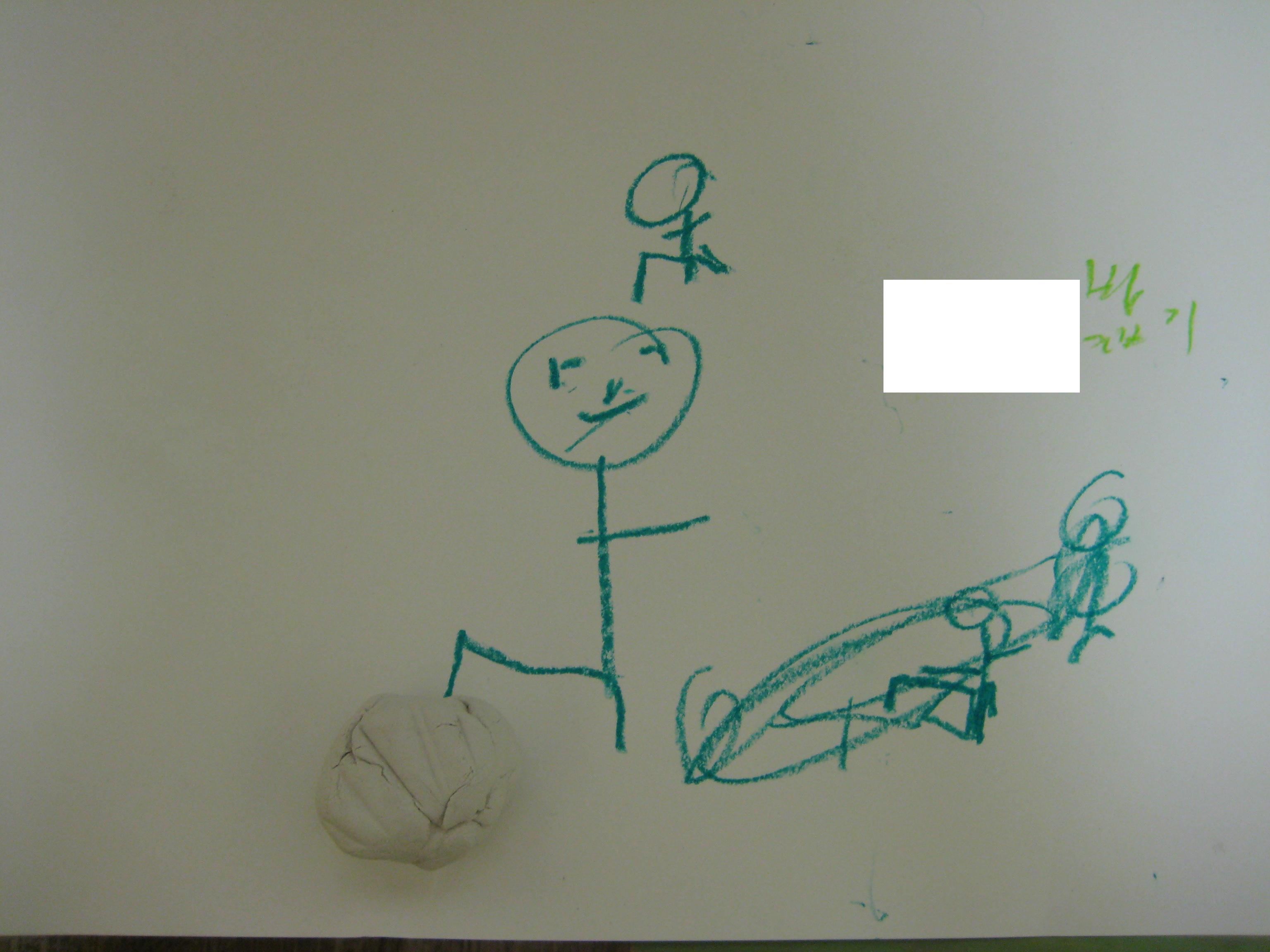 초등학교 4학년 남학생 그림. 화난 감정으로 자신을 크게 그려서 공을 밟고 있는 모습