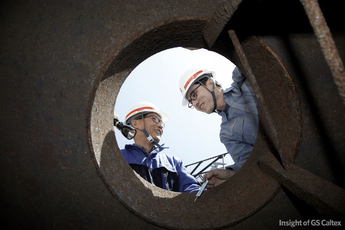 지난 3월 16일 시작돼 4월 12일에 종료된 여수공장의 대정비작업. 전체 공장가동을 멈추고 제1공장 기준으로 770여 개에 달하는 각종 장치의 내부를 점검하고 보수하는 작업으로 장치검사1팀과 검사원들의 스케줄은 빈틈없이 채워집니다. 지난 23년간 GS칼텍스 여수공장에서 동고동락하며 장치의 안전가동을 책임져온 한남테크노의 임병은 이사(좌)와 장치검사1팀 신용현 과장(우)이 나프타를 보관하는 저장탱크 안에서 탱크지붕을 검사하는 작업현장을 함께 둘러보고 있습니다.