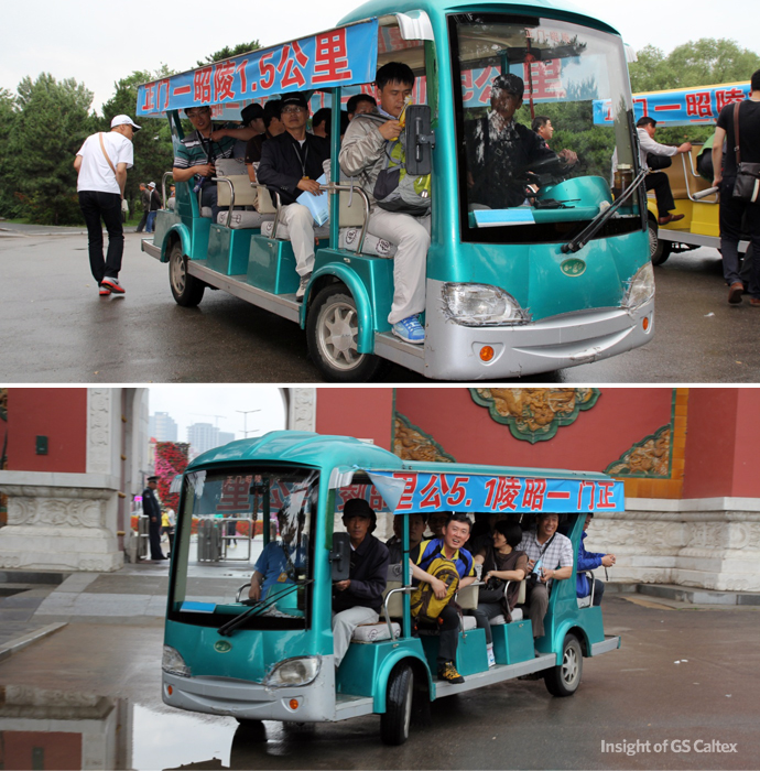 폭우가 쏟아지는 심양공항에 도착했습니다. 여기서부터 서울도착할 때까지 내내 비를 맞으며 여행을 다니는 불운을 맞이하게 됩니다. 빗길을 달려와 청태종의 무덤이 있는 북릉에 도착했습니다. 입장하고 난 후 아래와 같이 귀여운 셔틀버스를 이용해 수백 미터를 더 들어갔습니다.
