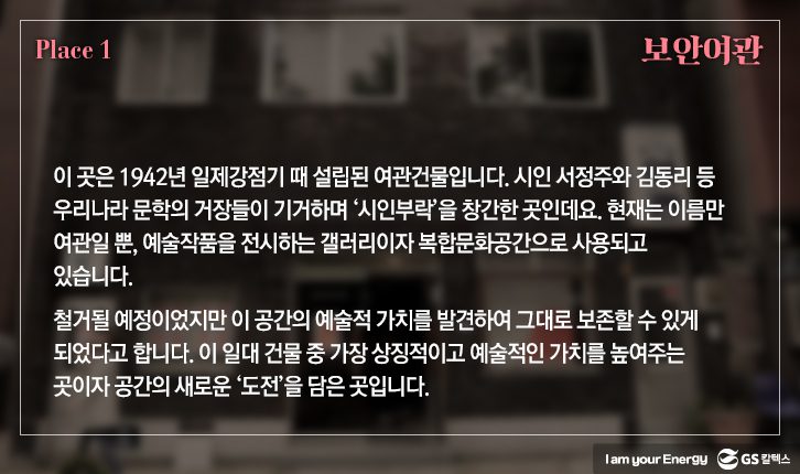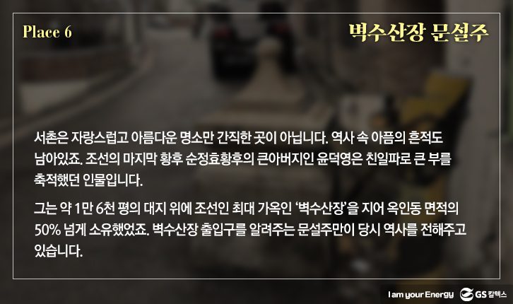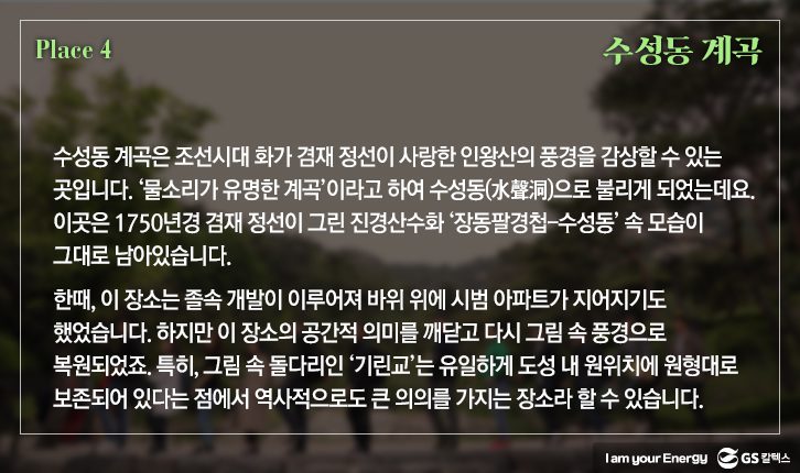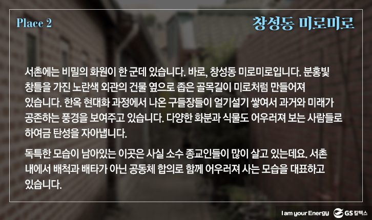 높은 건물과 빽빽한 담장 대신 낮고 얼기설기한 담장으로 담장 밖 풍경을 집에서 즐길 수 있는 재미난 동네, 서촌. 임직원 여러분 모두 동료나 가족과 함께 시간의 흐름이 축약된 이곳을 산책하며 도시를 새롭게 바라보는 시간을 가져보길 바랍니다.
