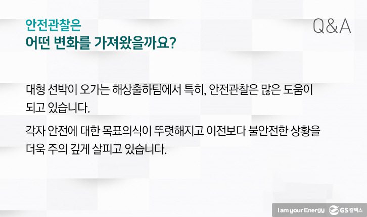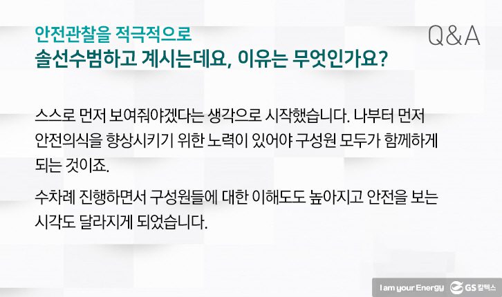 안전관찰은 회사 모든 사업장에서 임원부터 막내 직원까지 모두가 실천하고 있는 안전문화 개선 활동입니다. 이것은 회사 생활을 하면서 누구나 눈에 보이는 좋은 모습은 칭찬하고, 불안전한 행동과 상태는 담당자가 스스로 이해하고 개선할 수 있도록 대화로 유도해 나가는 활동입니다.