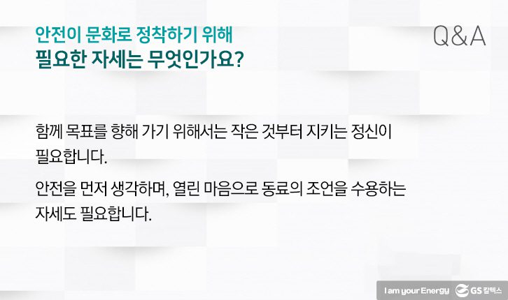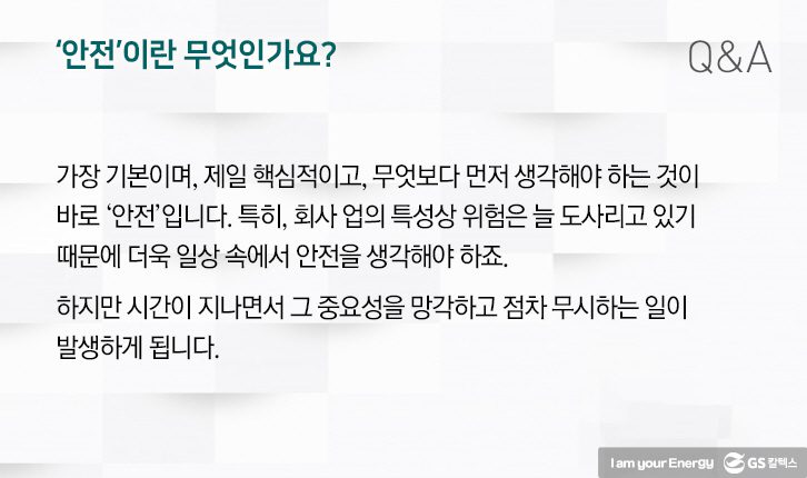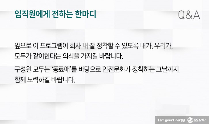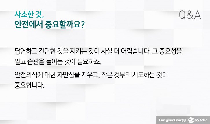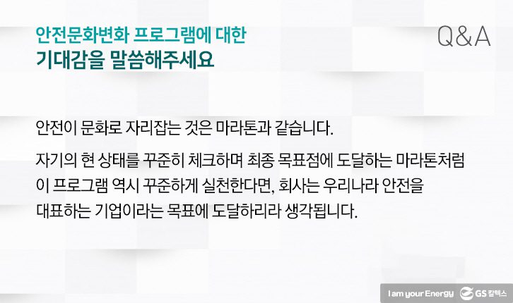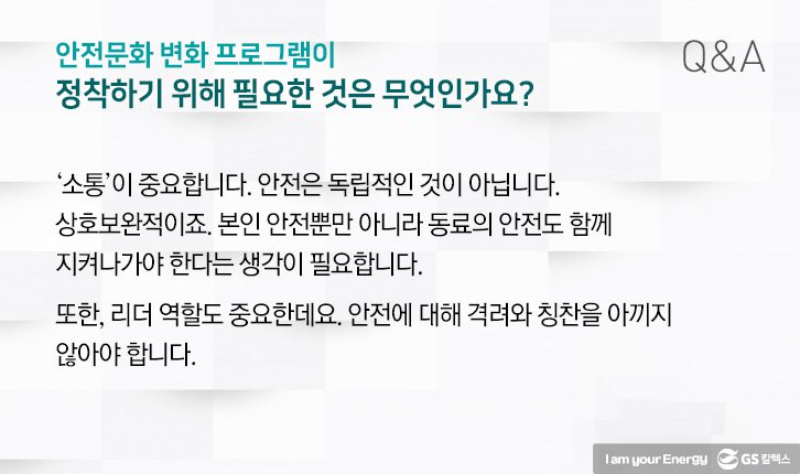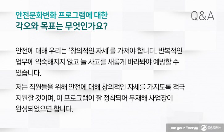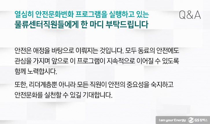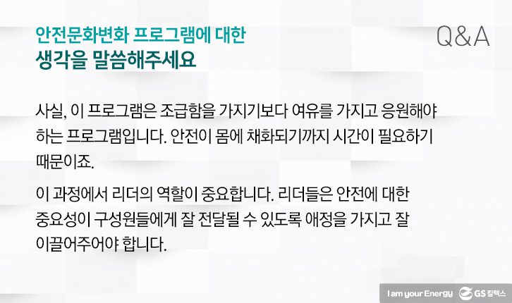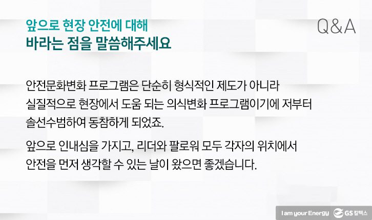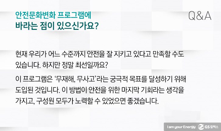 여러분, ‘안전문화변화 프로그램’이 아직은 낯선 부분도 있지만, 우리 임직원들이 열심히 노력하는 만큼 또 지속해서 실천해나간다면 분명 좋은 결실을 볼 수 있겠죠? 이번 글을 보시면서 나부터 안전을 생활화하겠다는 마음을 다시 한번 가져주시고 회사가 무재해 무사고를 달성할 수 있도록 모든 임직원이 한마음으로 노력해주시길 기대해 봅니다.