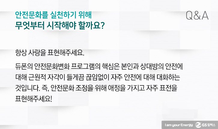 현장 경험과 사례가 많은 듀폰이 멘토가 되어 회사 생산본부, 물류센터, 인천윤활유공장, 기술연구소에 안전문화 코칭 및 실습을 실행하여 안전문화 수준을 향상시키는 프로그램.