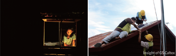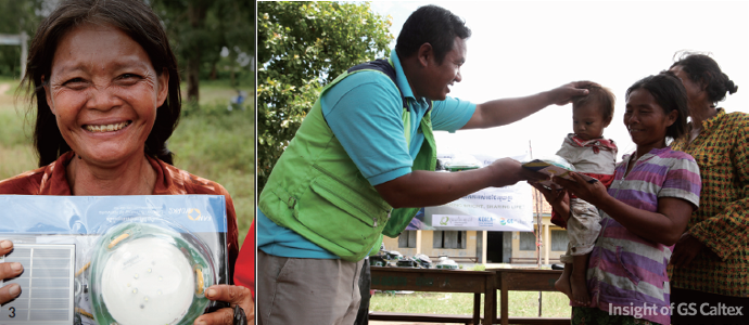 뿐만 아니라, 260여 명의 GS칼텍스 임직원들이 모금해 마련한 태양광 램프를 현지 가정에 직접 전달하기도 했습니다. 덕분에 캄보디아 결연 아동들은 이제 밤에도 태양광 램프 아래에서 열심히 공부하며 잘 지내고 있습니다.