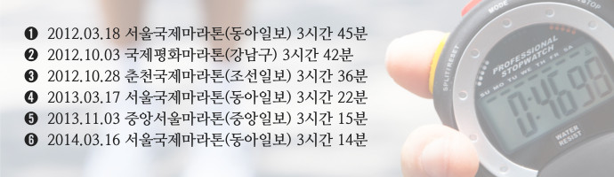 하지만 다행스럽게도 2주가 지나자 통증은 점차 줄어 들었고, 2012년 3월 서울국제마라톤에 참가해서 3시간 45분의 기록으로 풀코스 첫 완주를 경험했습니다.